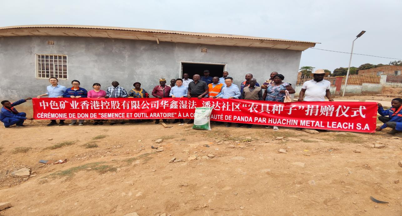 Representatives of CNMC Huaxin Hydrometallurgy Co., Ltd., a second-tier subsidiary of China Nonferrous Metal Mining (Group) Co., Ltd. (CNMC), pose for a group photo with local community members at a ceremony marking the donation of agricultural supplies from the company to Panda commune in Likasi, Haut-Katanga Province, the Democratic Republic of the Congo (DRC).