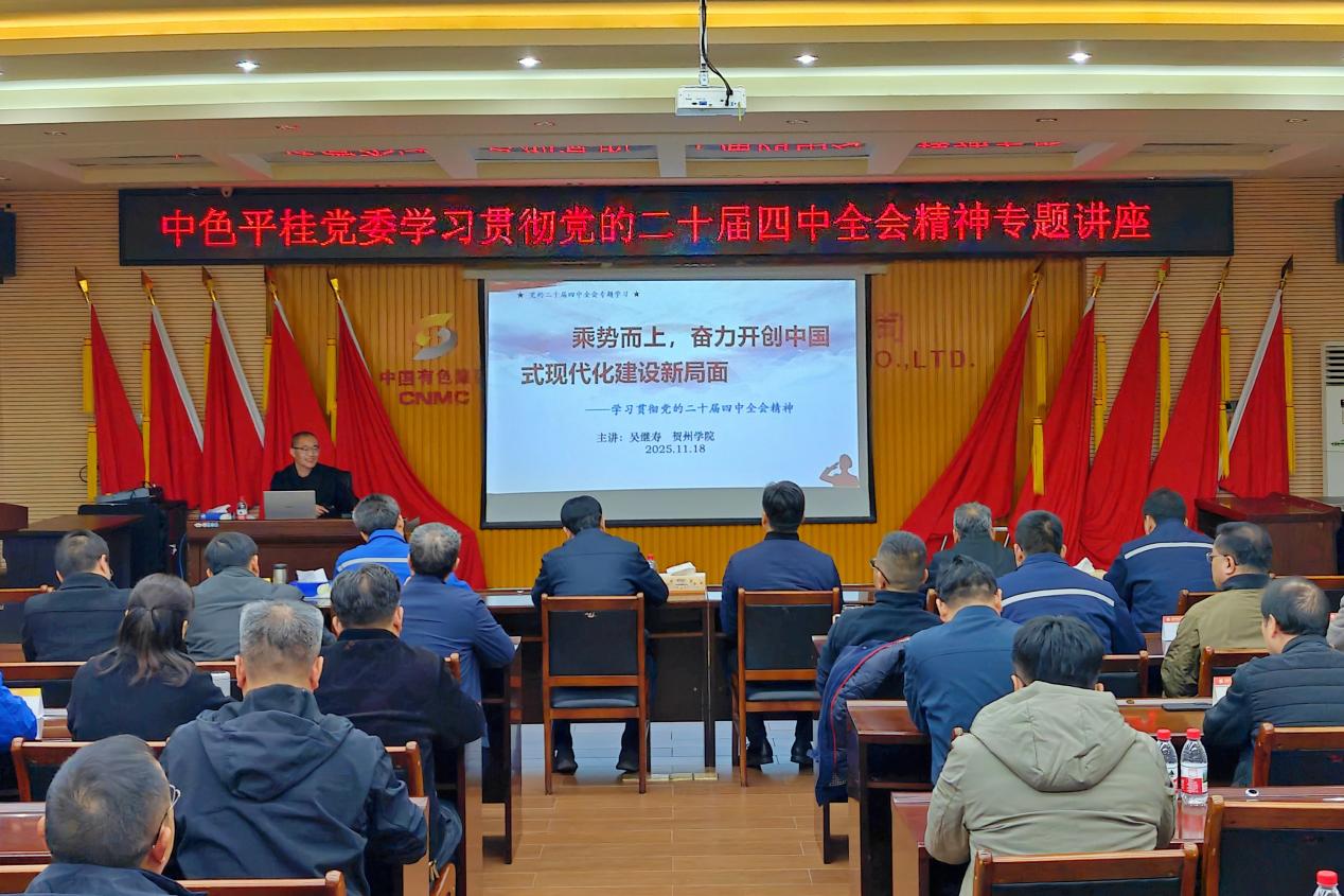 为深入学习贯彻党的二十届四中全会精神,11月18日,中色平桂举办学习贯彻党的二十届四中全会精神专题讲座,邀请贺州学院马克思主义学院教授、自治区“双进”教育宣讲团成员、贺州市委“二十届四中全会精神学习”“习近平谈治国理政第五卷精神学习”宣讲团成员吴继寿作专题宣讲。