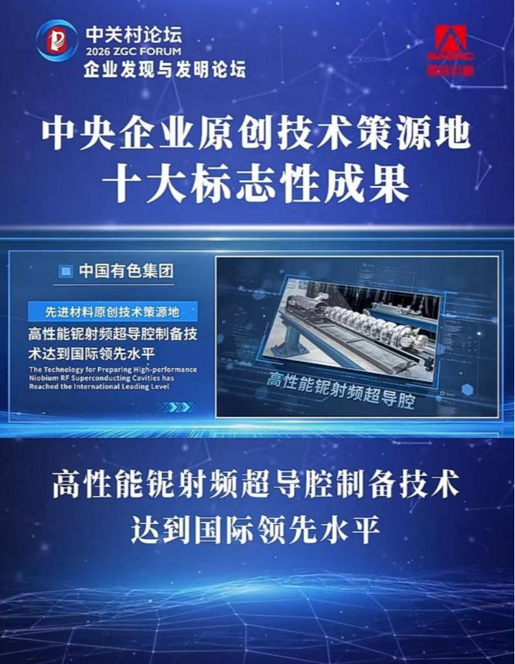 3月27日,在2026中关村论坛年会“企业发现与发明论坛”上,国务院国资委首次重磅发布“中央企业原创技术策源地十大标志性成果”,中国有色集团自主研发的“高性能铌射频超导腔制备技术”,凭借重大原创突破、全球领先性能与战略产业价值成功入选,成为先进材料领域唯一上榜的标志性成果,充分彰显了中国有色集团在前沿科技与关键材料领域的硬核创新实力。